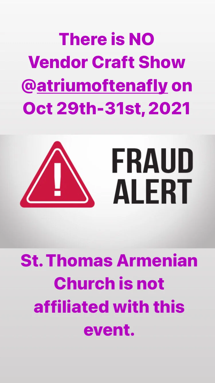 This is a warning that a fraudulent message from an impostor is texting our contacts stating that there is a vendor Craft Show at the Atrium of Tenafly on Oct. 29-31, asking for a vendor fee of $45.