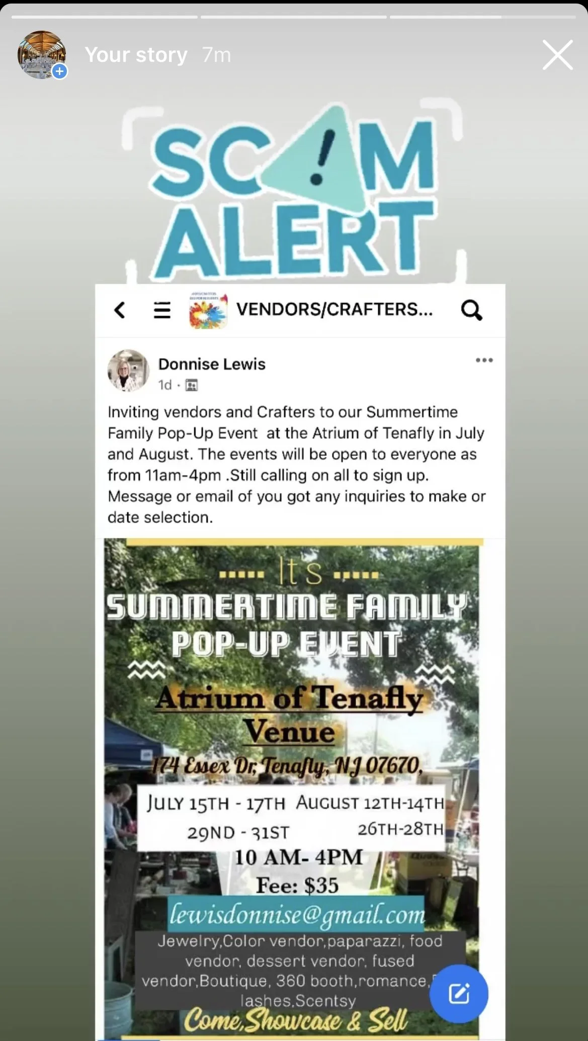 This is a warning that a fraudulent message from an impostor named Donnise Lewis stating on a certain vendor Facebook groups that, there is a Summer time Pop-Up Events at the Atrium of Tenafly for July 15th-17th and 29th-31th and August 12th-14th and 26th-28th, 2022 asking for a vendor fee of $35.